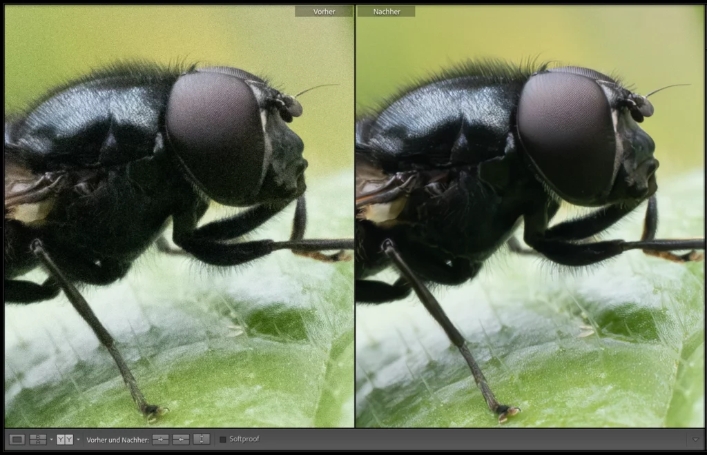Da Makrofotografie oft höhere ISO-Werte erfordert, spielt das Entrauschen eine große Rolle. Zu starke Rauschreduzierung glättet jedoch Details wie Härchen oder Pollen. Ideal ist es, das Rauschen vor allem in ruhigen Flächen zu reduzieren, während die Schärfe des Hauptmotivs erhalten bleibt. Lightroom und DxO PhotoLab nutzen z. B. KI-gestützte Werkzeuge, die Luminanz- und Farbrauschen entfernen, ohne Details zu zerstören. Arbeitet zusätzlich mit Masken, wenn ihr nur bestimmte Bereiche entrauschen wollt.