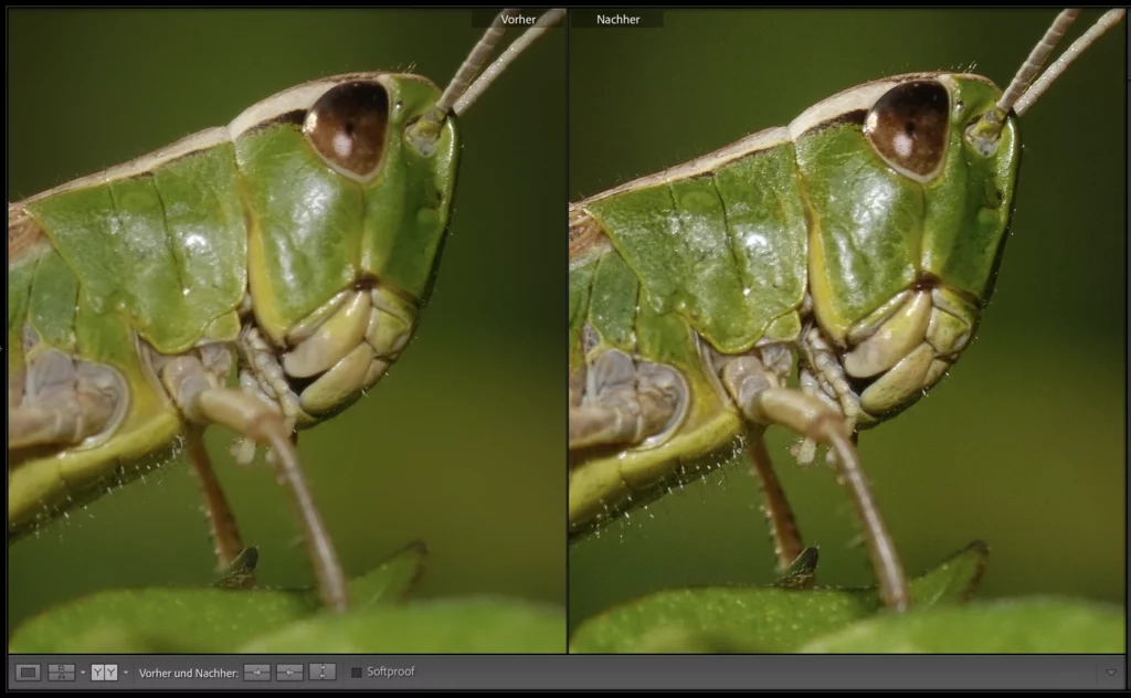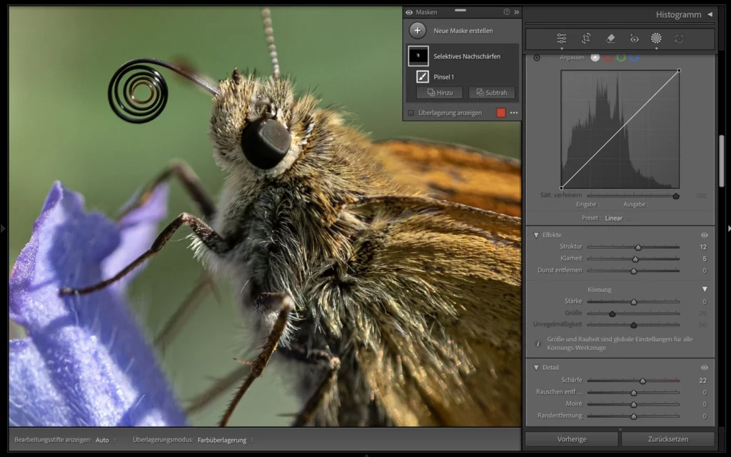 Da Makros meist nur einen kleinen Schärfebereich haben, ist selektives Nachschärfen sinnvoller als das ganze Bild zu bearbeiten. Mit Masken könnt ihr etwa die Augen eines Insekts betonen, ohne den Hintergrund unruhig wirken zu lassen. Lightroom, DxO PhotoLab oder Photoshop bieten dafür flexible Werkzeuge. Die selektive Nachschärfung wird meist am Ende der Bearbeitung, kurz vor dem Export oder dem Druck, angewendet.