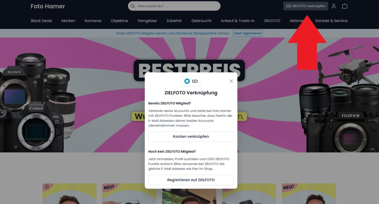Einer dieser Codes ist 10.000 € wert. Um herauszufinden, ob ihr das große Los gezogen habt, müsst ihr zunächst einmal euer ZIELFOTO-Konto mit eurem Kundenkonto bei Foto Hamer verknüpfen. Seid ihr auf beiden Seiten mit der gleichen E-Mail-Adresse registriert, genügt ein Klick auf den Button “ZIELFOTO verknüpfen” auf der Startseite von Foto Hamer: