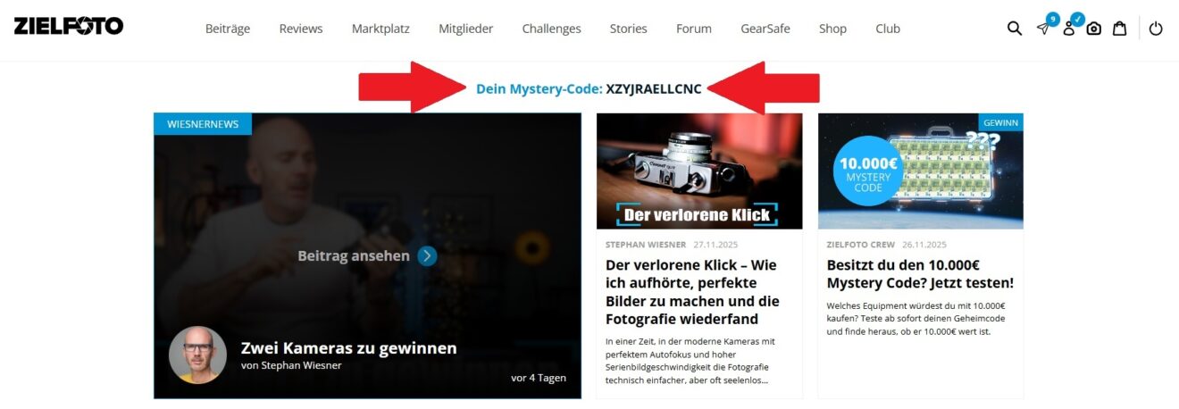 Wer Mitglied in der Community von ZIELFOTO ist und sich in sein Kundenkonto einloggt, findet bis zum 01.12.2025 oben auf der Startseite einen individuellen Mystery Code: