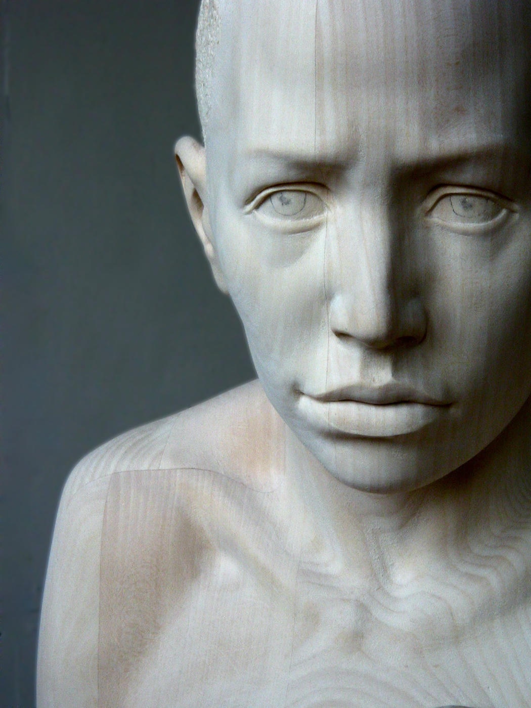 Das Foto ist ein Ausschnitt einer Skulptur aus Holz aufgenommen im Studio des Künstlers.