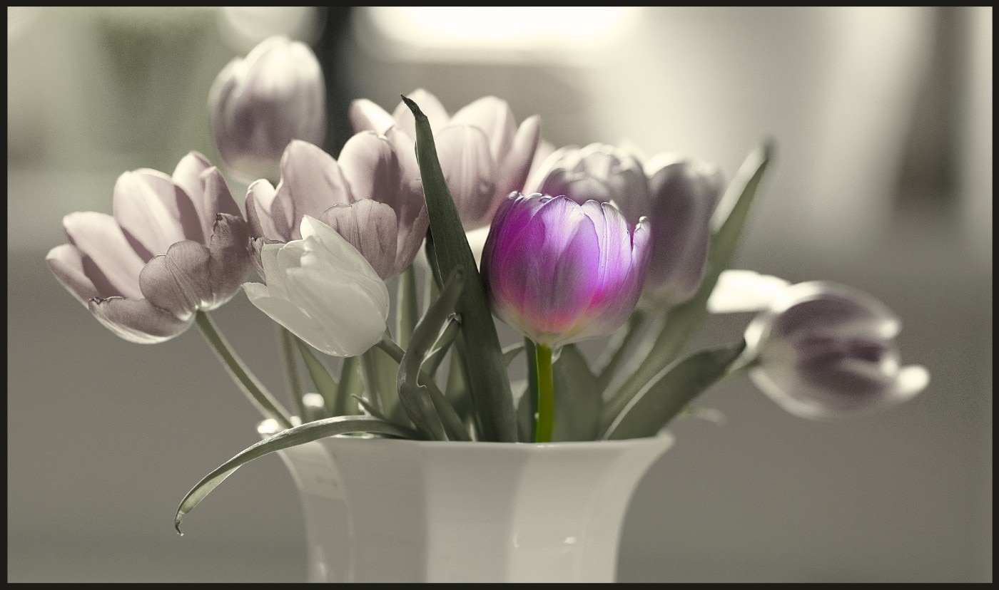 Was macht man fotografisch nicht alles, wenn das Wetter draussen scheusslich ist (aber auf dem Esstisch ein frischer Tulpenstrauss vom Discounter steht)? … Richtig ! … Anschliessend habe ich versucht, das Motiv in der Bildbearbeitung noch etwas zu “optimieren”.