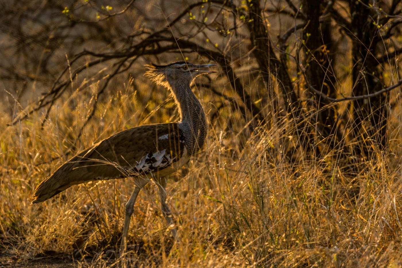 Eine Riesentrappe im wunderschönen Abendlicht kurz vor Sonnenuntergang.