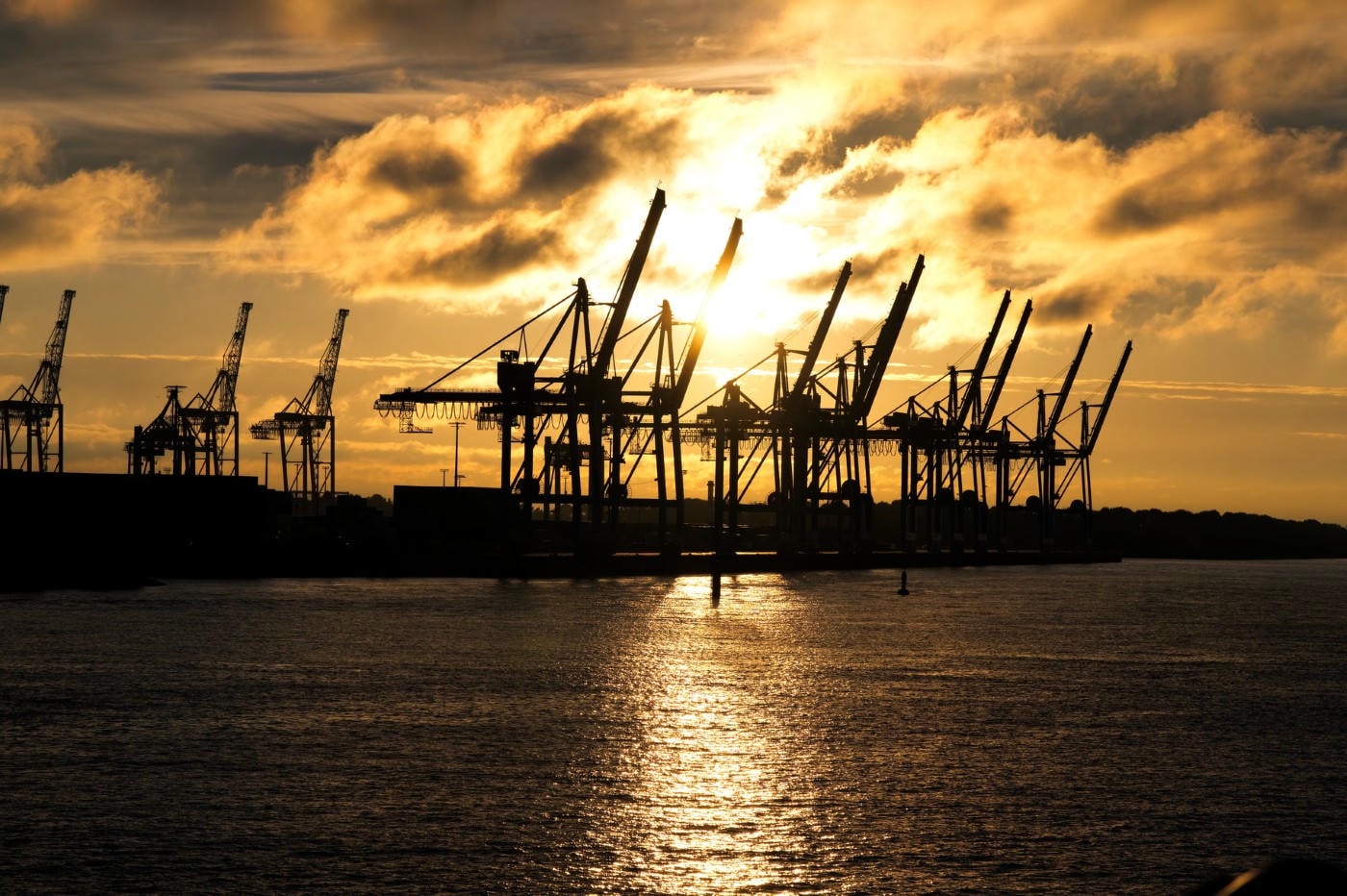 Kransilhouette am Hamburger Hafen, war am Vorabend eine Reise mit Hurtigruten Expeditions von Hamburg ans Nordkap im Oktober 2021