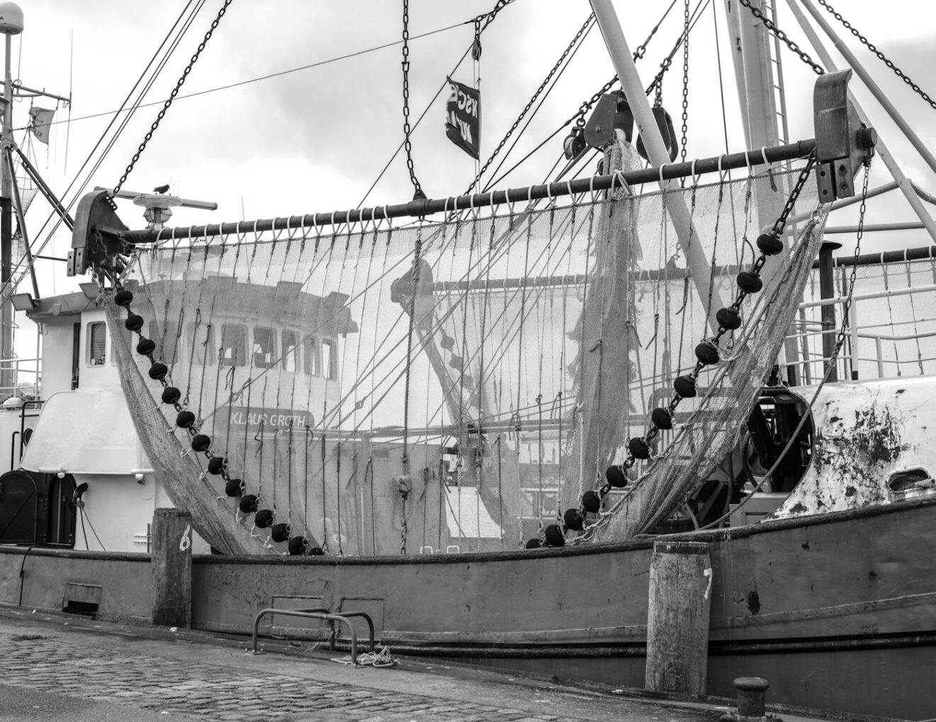 Rückseitenwetter – nach Durchzug einer Kaltfront bestimmte ein kurzeitiges Hoch von wenigen Stunden mit milden und warmen Winden die Wetterlage. Dann folgte ein Sturmtief – viele Fischkutter suchten Schutz; die Pier ist auch mit Holländern doppelt besetzt.