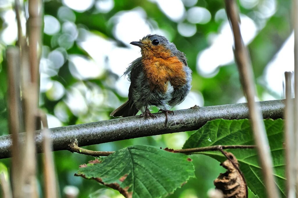 Junges Rotkehlchen blickt neugierig in die Kamera.