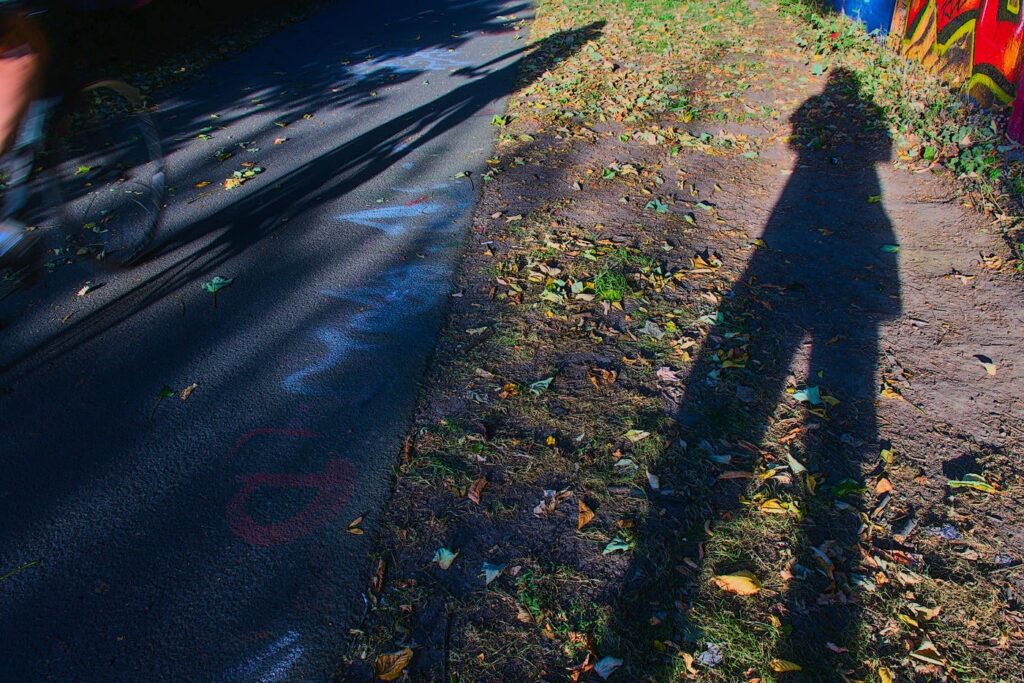 Licht und Schatten: Der “Sonnenuntergangsspaziergang” bot sich hervorragend für Schattenspiele an. In dem Moment fuhr ein Fahrradfahrer vorbei.