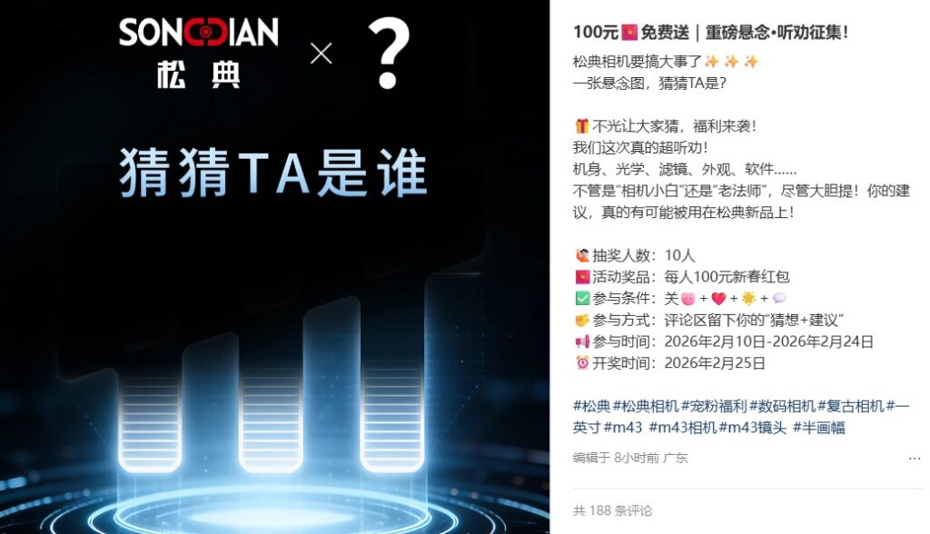 In der Pressemitteilung wird bereits bestätigt, dass Sonida “konforme Produkte” für das Micro-Four-Thirds-System auf den Markt bringen wird. Genaue Details werden aber noch nicht genannt. In den letzten Tagen wurde in der Gerüchteküche bereits gemunkelt, dass zeitnah eine Songdian Micro-Four-Thirds-Kamera vorgestellt werden könnte. Dazu passt ein Post in den sozialen Medien inklusive Teaser-Bild. Dort schreibt der chinesische Hersteller unter anderem “die Songdian-Kamera hat Großes vor”, zudem wird als Hashtag #m43kamera verwendet.