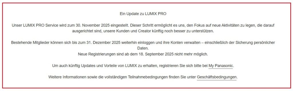 Schon seit dem 18. September 2025 sind keine neuen Registrierungen für den Lumix Pro Service mehr möglich. Bestehende Mitglieder können sich noch bis zum 31. Dezember 2025 einloggen und ihre persönlichen Daten sichern.