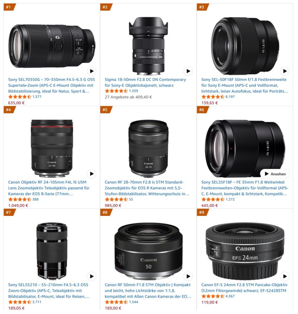Auch bei den Objektiven dominieren Canon und Sony – wie gesagt, Angebote für Objektive von anderen Herstellern findet man am Prime Day kaum.