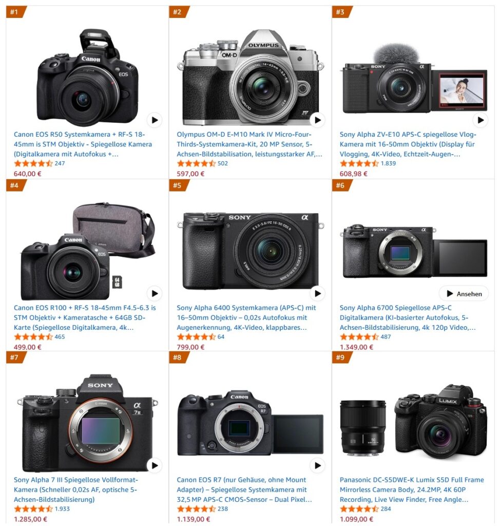 Die Bestseller-Liste im Bereich Kameras wird dominiert von den APS-C-Kameras von Canon und Sony. Das ist keine große Überraschung, zum einen weil Canon und Sony die beiden Hersteller mit den meisten Prime Day Angeboten sind, zum anderen weil die breite Masse eben nach wie vor vermehrt (günstigere) APS-C-Kameras kauft. Teure Vollformatkameras stehen beim Prime Day nicht im Fokus, die werden ohnehin eher im Fachhandel gekauft.